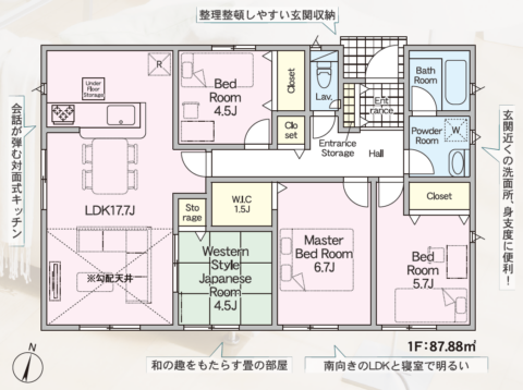 - システムキッチン/対面キッチン/浴室暖房乾燥機/シャワー付洗面化粧台/温水洗浄便座/ウォークインクローゼット/24時間換気システム/玄関収納