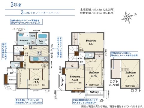 - システムキッチン/対面キッチン/浴室暖房乾燥機/シャワー付洗面化粧台/トイレ2カ所/温水洗浄便座/ウォークインクローゼット/24時間換気システム/玄関収納/食器洗い乾燥機/ロフト